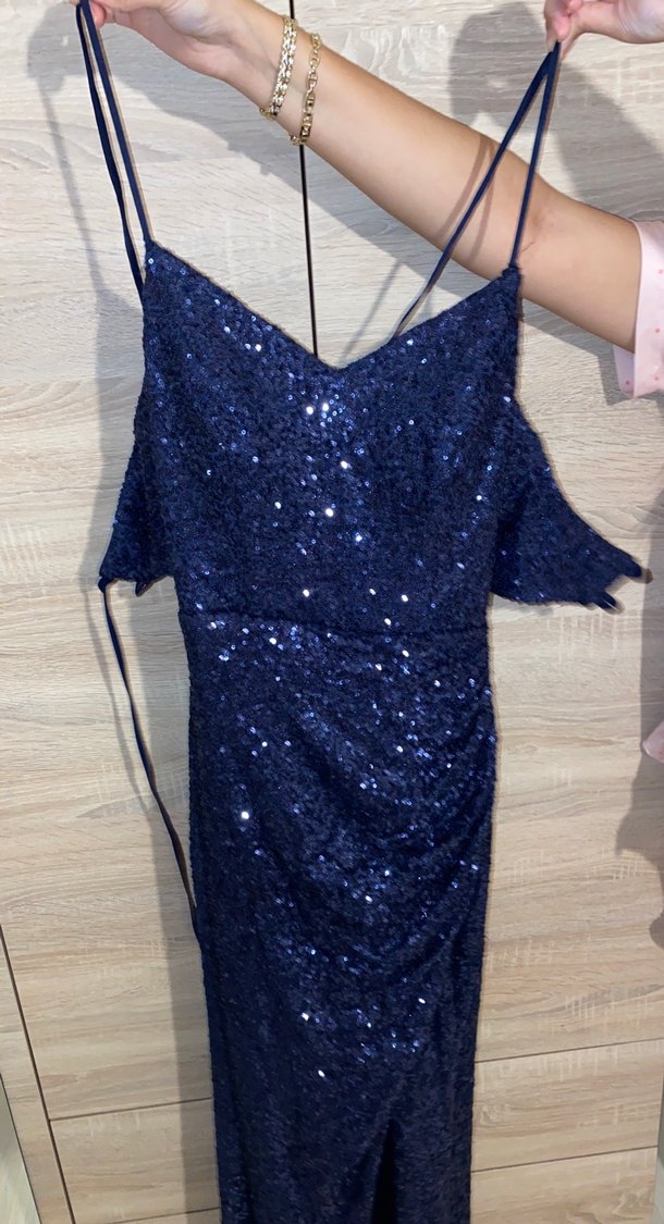 Lacivert, ışıltılı kumaştan, V yakalı ve ince askılı uzun abiye elbise, gösterişli parti kombinleri için uygundur. ✨