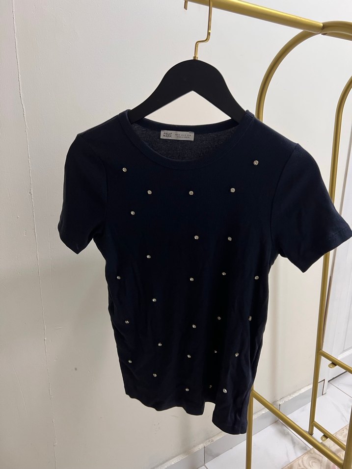 Lacivert, payetlerle süslenmiş, kısa kollu ve bisiklet yaka, denim görünümlü dar kesim tişört. Günlük sokak stili için uygun. ✨