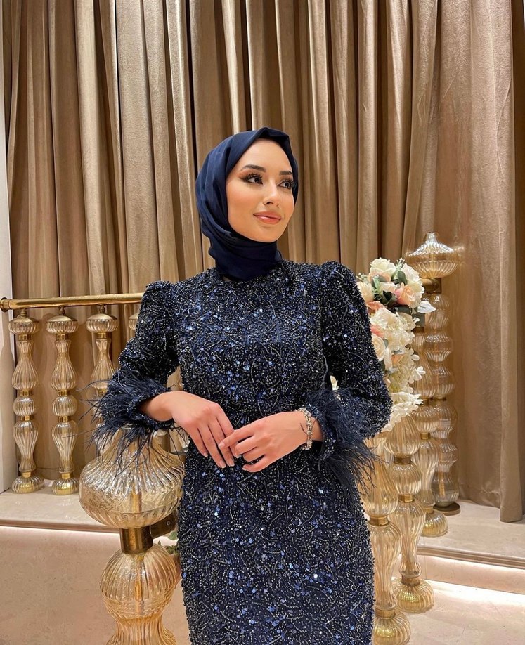 Lacivert Payetli Uzun Abiye Elbise