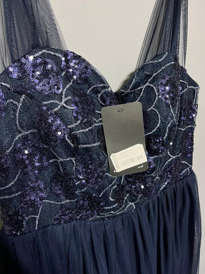 Lacivert, straplez yakalı, payetli ve nakışlı detaylara sahip, askılı kollu, dar kesim uzun abiye elbise. ✨