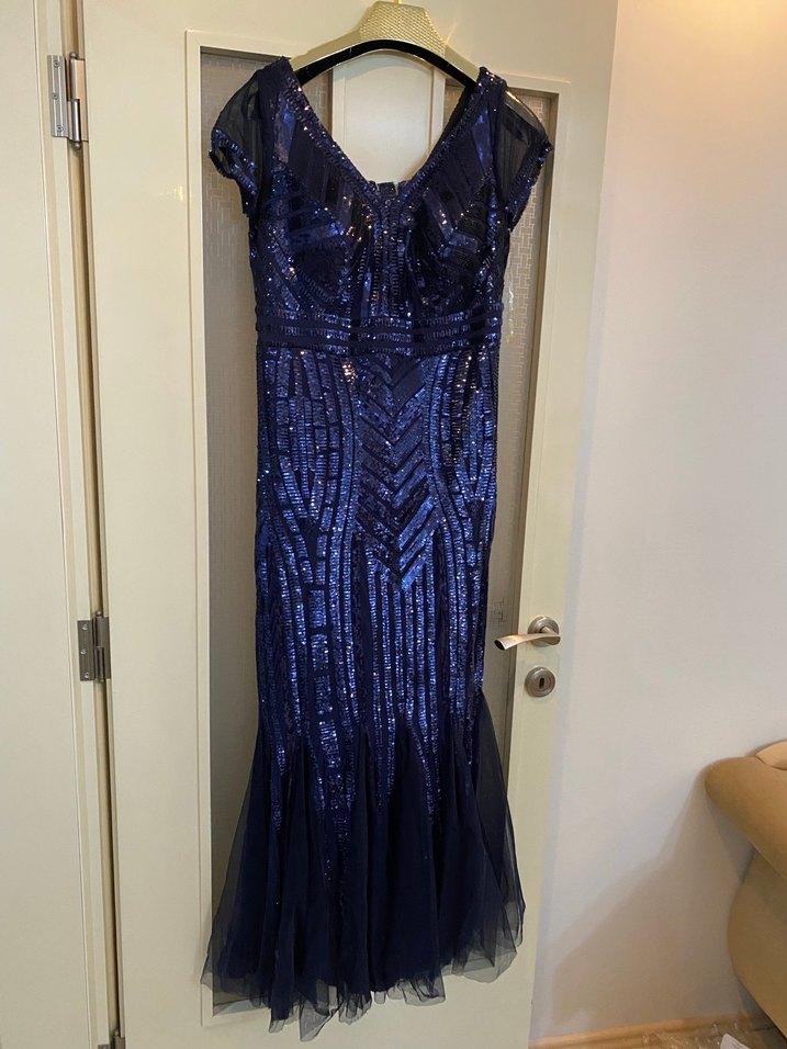 Lacivert renkte, V yakalı ve kolsuz, payet işlemeli uzun abiye elbise. Düğünler için uygun, şık ve çağdaş bir modeldir. ✨