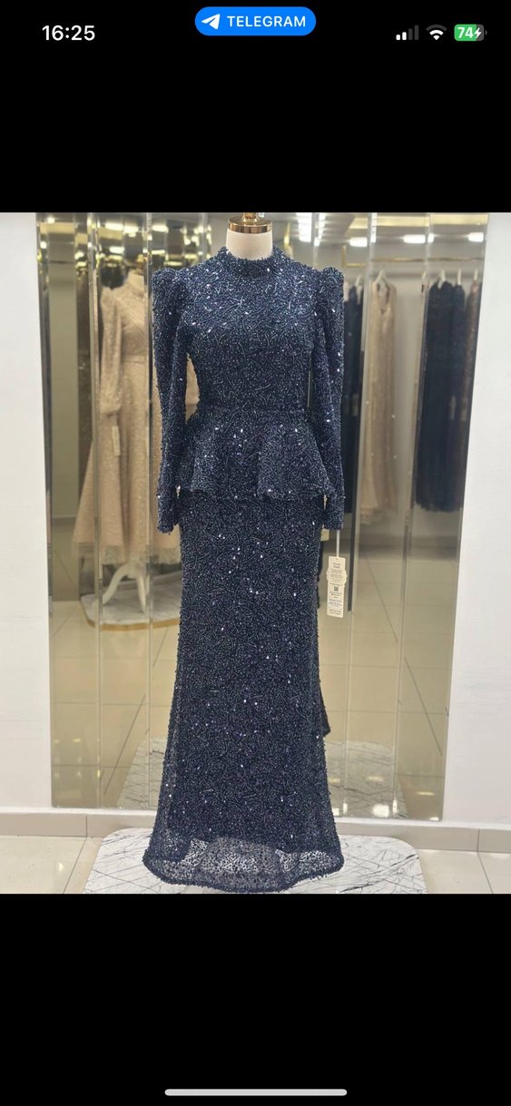 Müsaitlik için yazınız Lacivert renkte, payetli kumaştan yapılmış, uzun kollu ve yüksek yakalı uzun abiye elbise. Düğünler için uygun, klasik ve çağdaş tasarım sunar40/44bedenler
