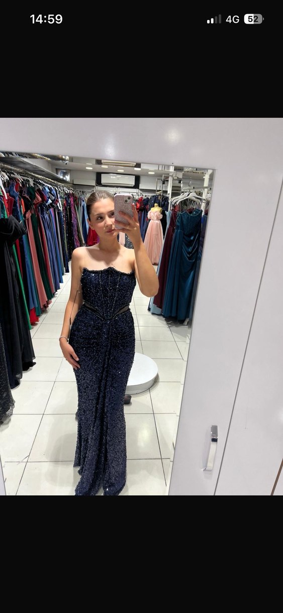 Lacivert Payetli Uzun Straplez Abiye Elbise