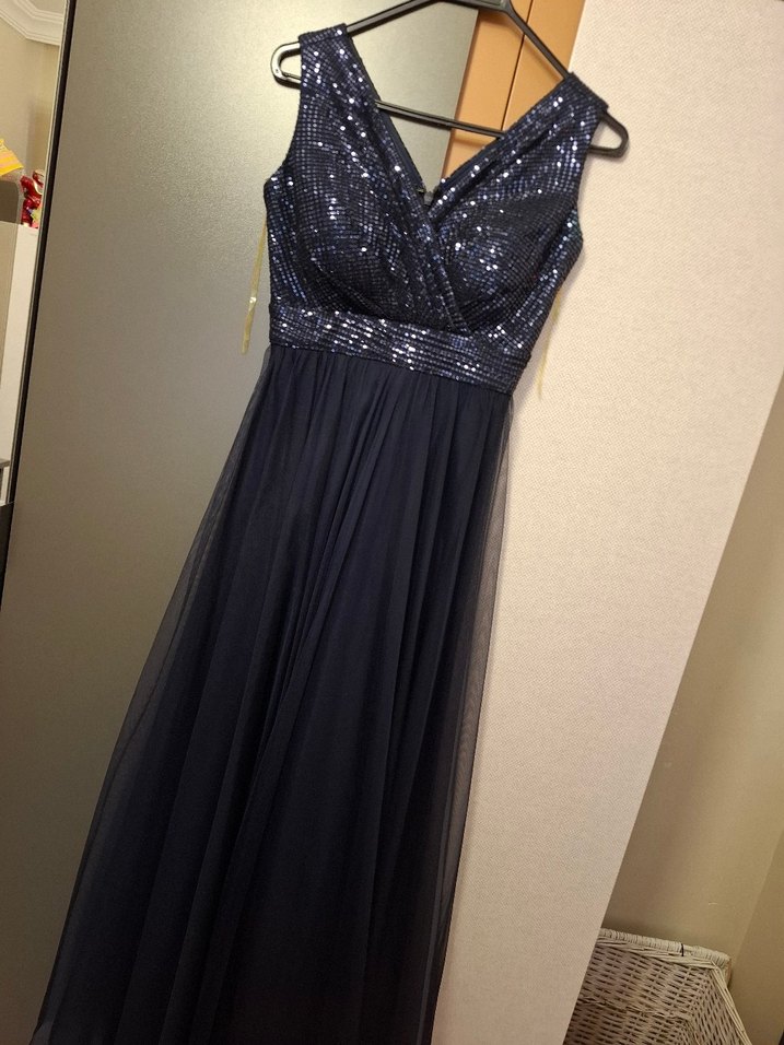 lacivert payetli V yaka sıfır kol Uzun Abiye Elbise