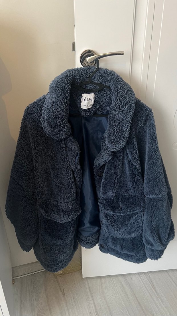 Lacivert peluş kumaştan, kürk detaylı, notched lapel yakalı, bol kesim midi uzunlukta kaban. Günlük rahat sokak stili için uygundur. m/L