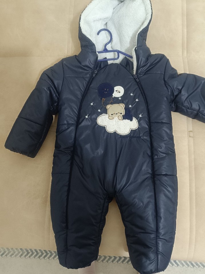 Lacivert renkte, yumuşak ve sıcak iç peluş astarlı, kapüşonlu ve baskılı detaylı bebek tulumu. ❄️