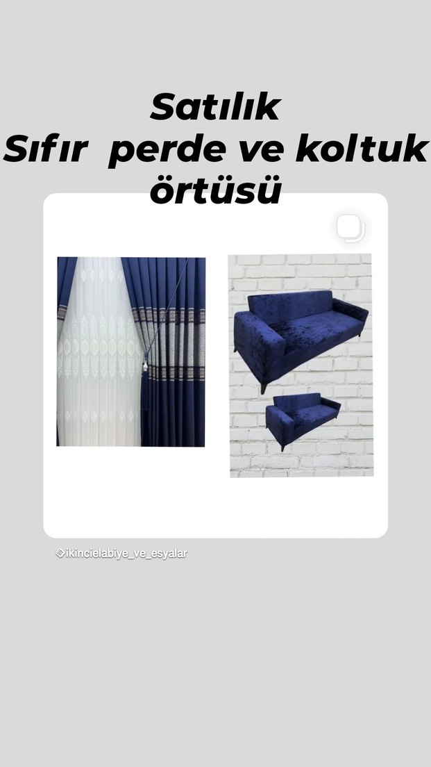 Baskılı desenli lacivert perde ve uyumlu koltuk örtüsü sıfır olarak satılıktır. ️