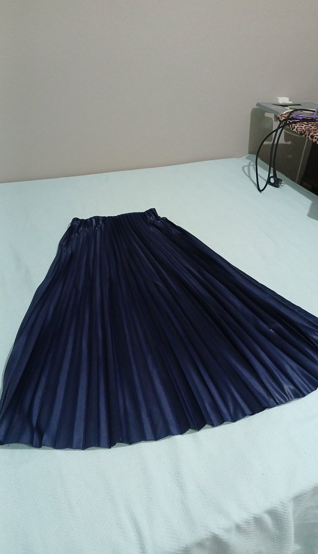 Lacivert renkte, pileli ve bol kesim uzun kadın eteği. Yumuşak sentetik kumaştan, minimalist ve goth tarzlara uygun, parti için ideal.