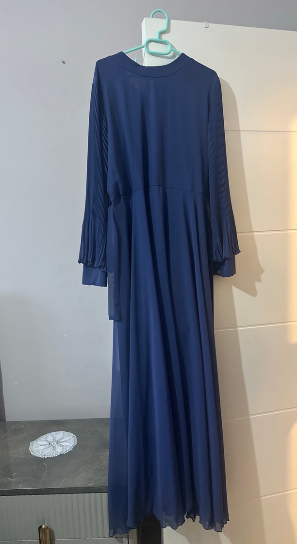 Lacivert Pileli Uzun Kollu Uzun Elbise
