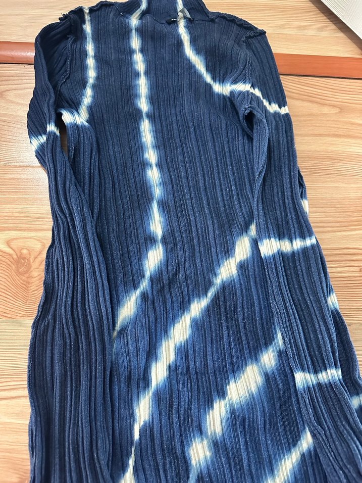 Lacivert, pilili, uzun kollu triko elbise, bohem tarzda, balıkçı yaka ve fit kesimlidir. Tie-dye desenlidir.