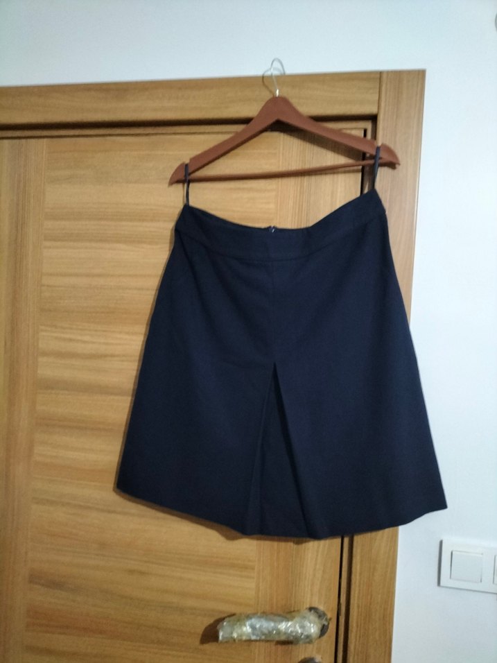 Lacivert renkte, pilili ve normal boy hamile eteği, rahat kesimi ve sentetik kumaşı ile ofis kullanımına uygundur.