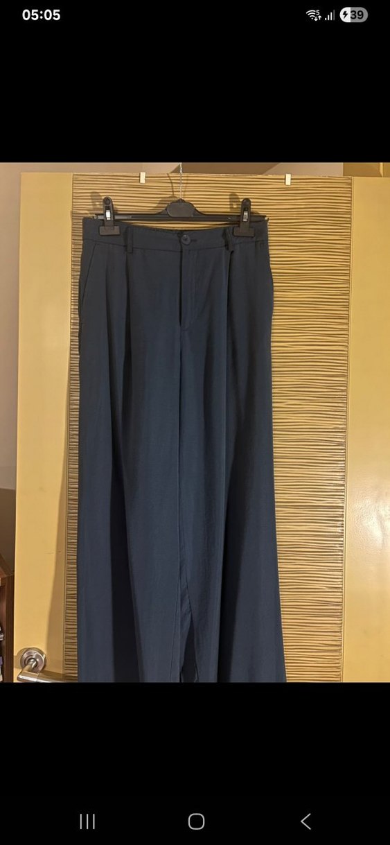 Lacivert kumaştan, pilili ve uzun kesime sahip bu kadın pantolonları, iş ortamı için uygundur ve sade desensizdir.