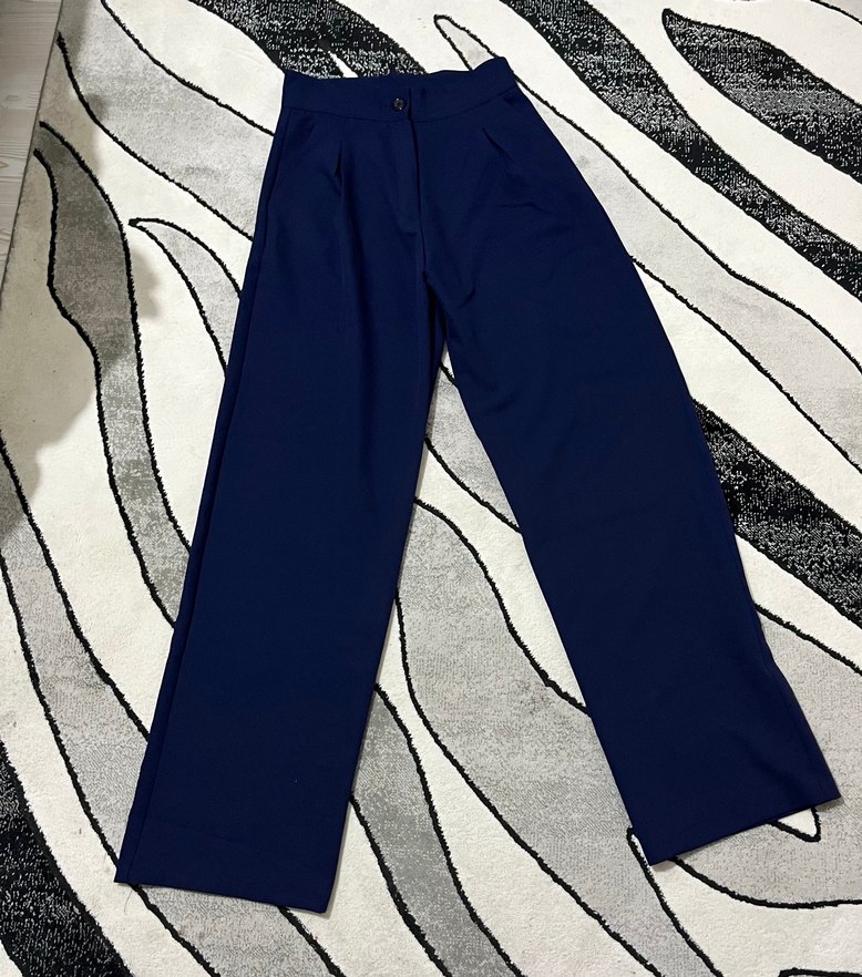 Lacivert renkli, regular fit kesim, pilili kadın kumaş pantolon. Sentetik kumaştan üretilmiş, midi boy ve desensizdir. Günlük kullanıma uygundur.