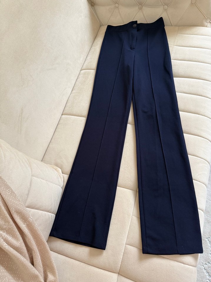 Lacivert renkte, pilili ve normal boyda kadın kumaş pantolon. Ofis kullanımı için uygun, düz ve rahat kesim.
