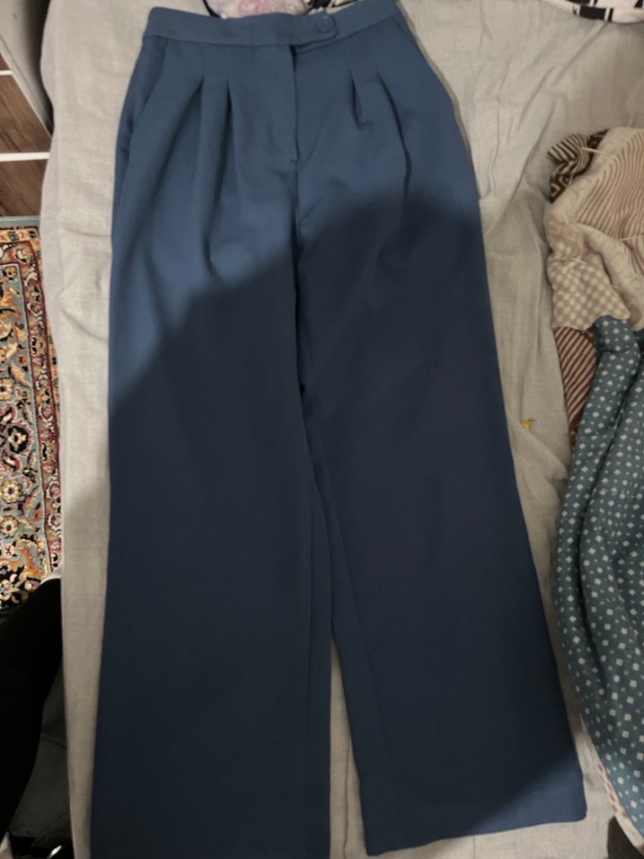 Lacivert kumaştan, pilili, normal boy midi uzunluğunda, regular fit kadın pantolon. Ofis için uygun, trend casual tarzda. 34 beden