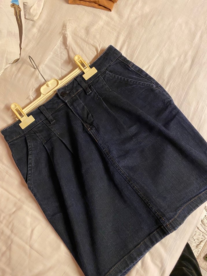 Lacivert renk, pilili ve bol kesim midi uzunluğunda kadın denim etek. Günlük rahat kullanıma uygun sade tasarım.