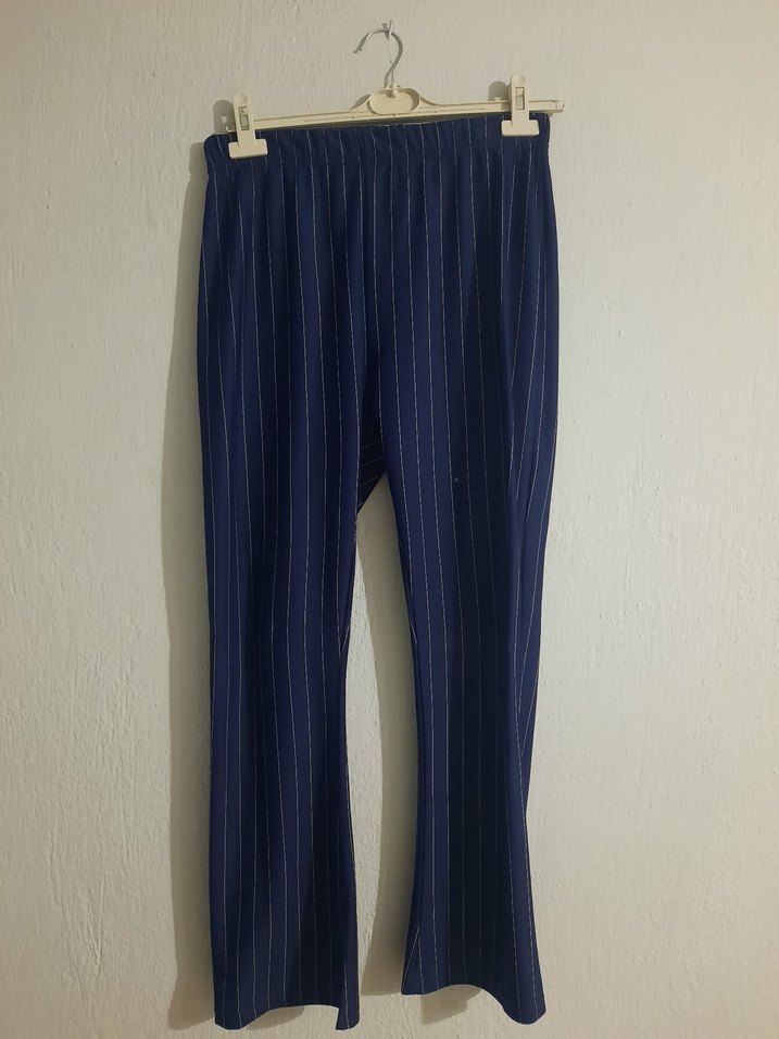 Lacivert pilili, parlak görünümlü, normal boy midi kadın pantolon. Rahat kesimiyle günlük sokak ve athleisure stiline uyum sağlar.