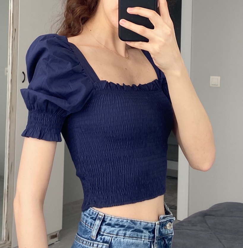Lacivert renkli, pilili ve kısa balon kollu, denim kumaştan yapılmış, straplez yaka tasarımlı, trend görünümlü kadın bluz. Günlük kullanım için uygundur.