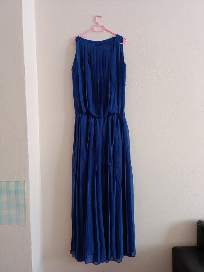 Lacivert renkte, yüksek yakalı ve kolsuz pilili uzun keten elbise. Bol kesimi ve bohem tarzıyla parti için uygundur.