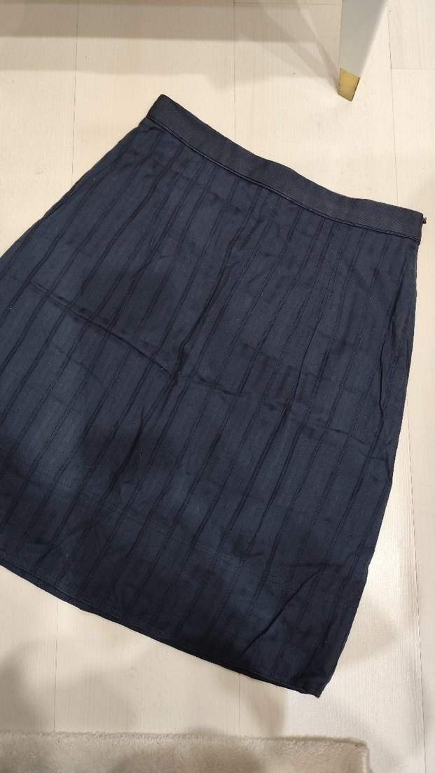 Lacivert renkli, keten kumaştan yapılmış, pilili ve midi boyda, dar kesim etek Ofis için uygun, minimalist sokak stiline uyum sağlar.
