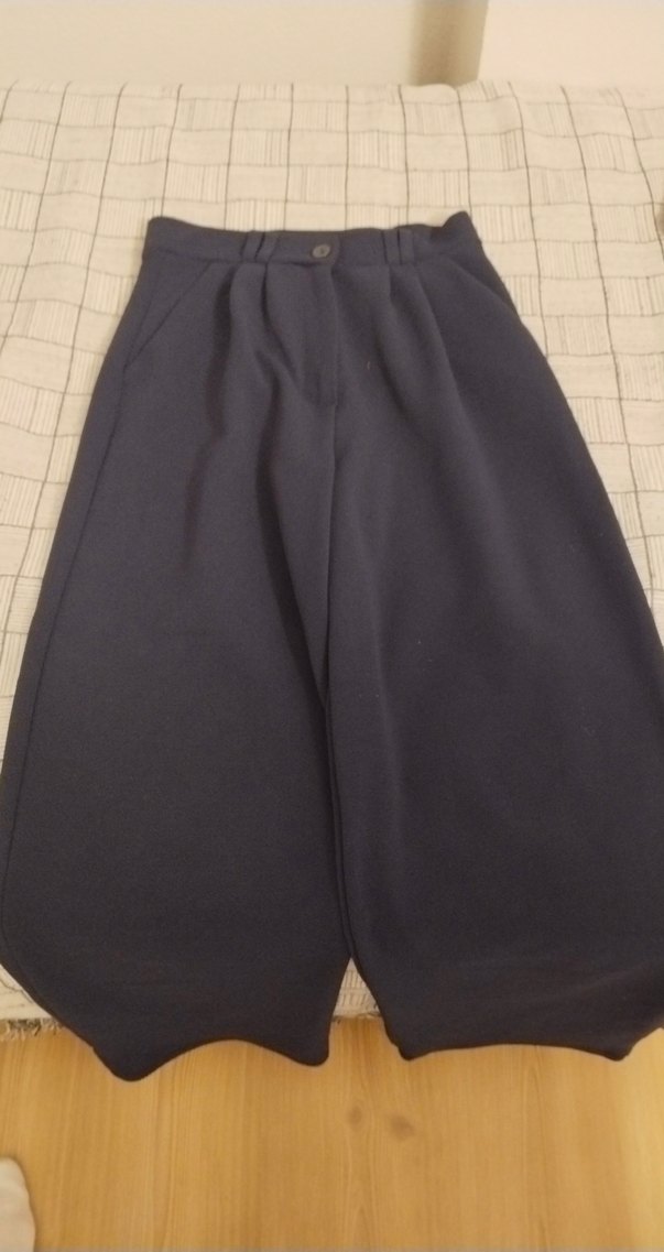 Lacivert, midi boy, bol kesim, pilili kadın kumaş pantolon. Düz renk ve sentetik dokulu, ofis için uygun normcore tarzda. 38 40 a kadar bedenler uygundur