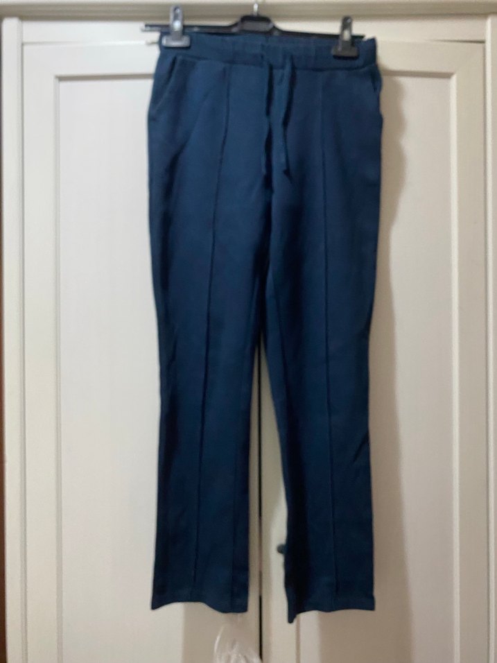 Lacivert renkli, denim kumaştan, pilili ve normal kesim midi uzunluğunda kadın pantolonu, ofis kullanımı için uygundur.