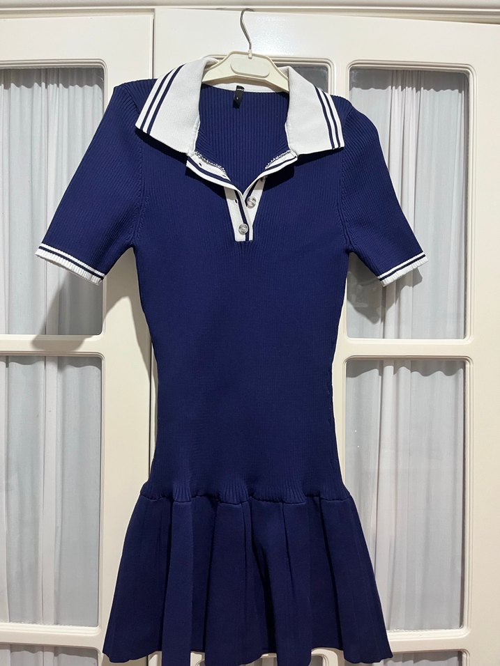 Lacivert renk, pilili etek ve polo yaka detaylı, kısa kollu, sentetik kumaştan kadın elbisesi. Sokak modasına uygun, günlük kullanıma uygundur.