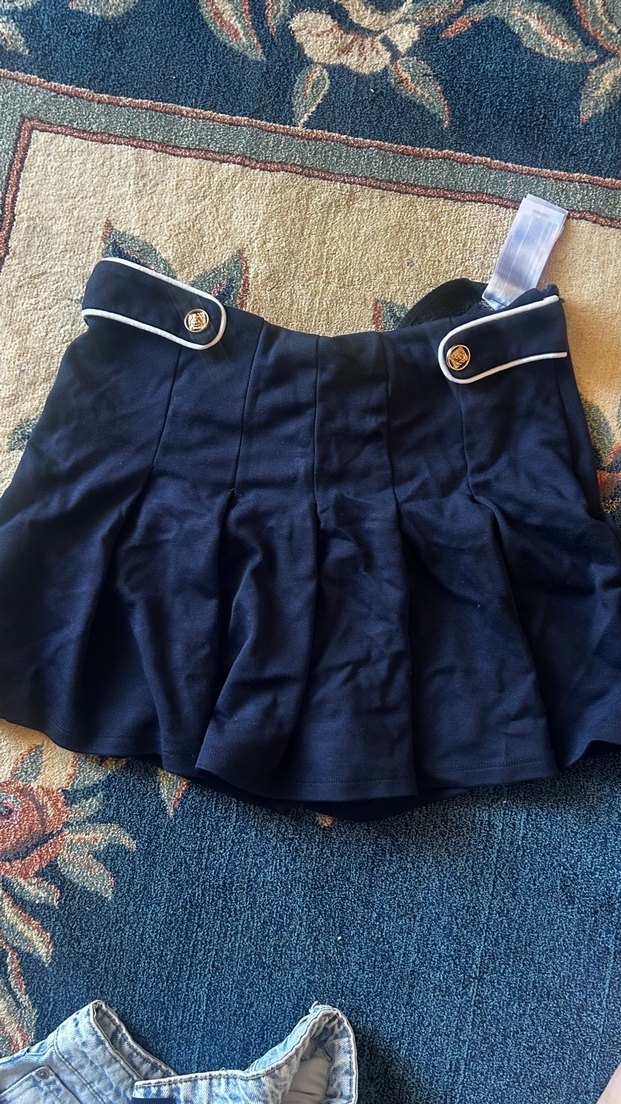 Lacivert renkli, pilili ve fitted kesim mini etek. Altın düğme detayları ve sentetik kumaştan üretilmiştir. Günlük sokak stili için uygun. Hiç kullanılmamıştır