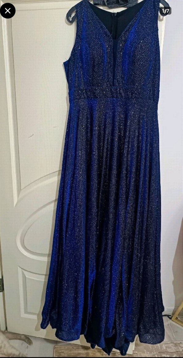 Lacivert renkte, pilili detaylara sahip, uzun ve dar kesim abiye elbise. Kayık yaka ve ince askılı, parti için uygun şık tasarım. bir kere bile giyilmedi 48 ve 50 bedene uyumlu simli lacivert parıl parıl mide kucultme oldum zayıfladığı için satıyorum