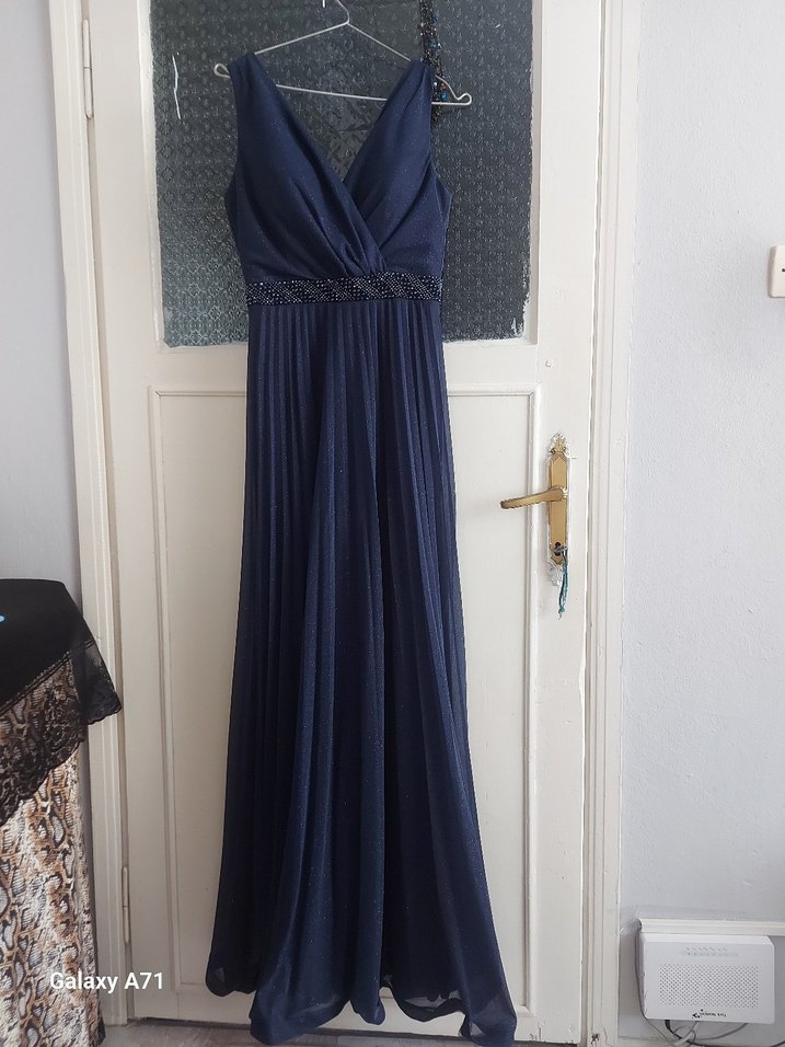 Lacivert renkte, pilili uzun abiye elbise. Kayık yaka, kolsuz ve rahat kesimlidir. Düğün ve özel davetler için uygundur, klasik şıklık sunar.