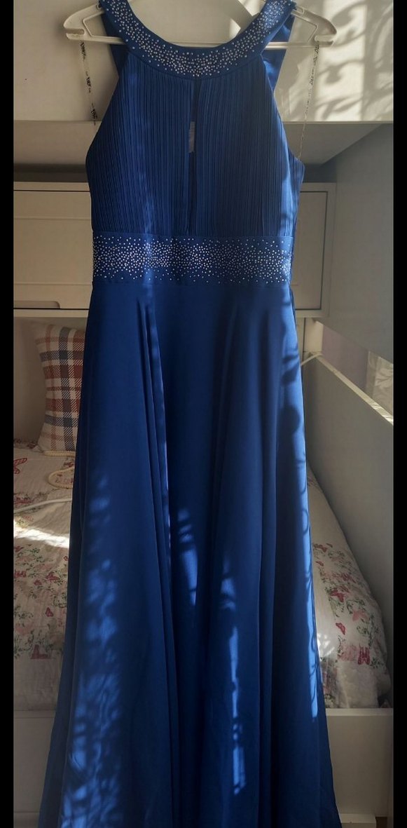 Lacivert uzun abiye elbise, V yaka ve kolsuz tasarımla, pilili detaylar ve ışıltılı bel süslemeleriyle düğünler için uygundur. ✨