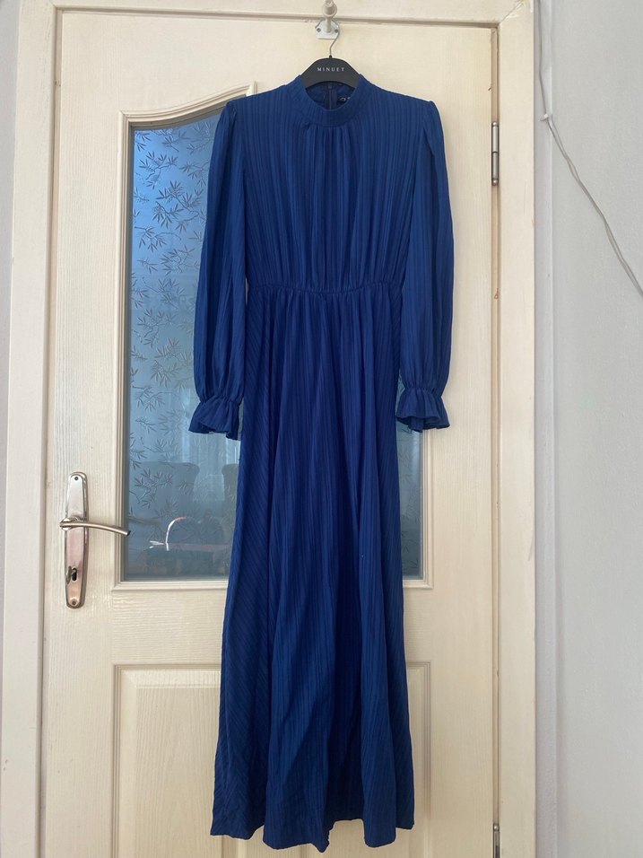 Lacivert renkte, pilili detaylara ve yüksek yakaya sahip uzun elbise. Bol kesim ve uzun kollu, modern klasik tarzda, ofis için uygun.