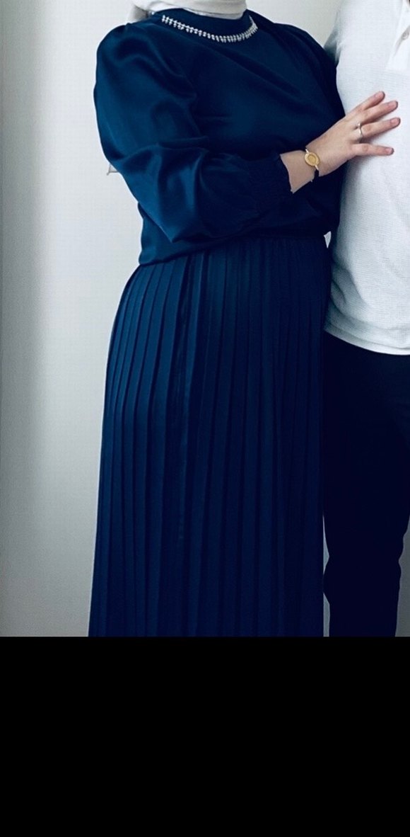 Lacivert pilili uzun bol kesim ve sentetik kumaştan üretilmiştir. Desensiz ve mütevazı tasarımı romantik akşamlar için uygundur. Alt üst takım gönderilecek