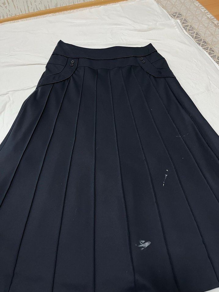 Lacivert pilili, uzun kesim kadın eteği. Yumuşak sentetik kumaştan, bol kesim ve gotik, avangard tarzda günlük kullanım için uygundur.