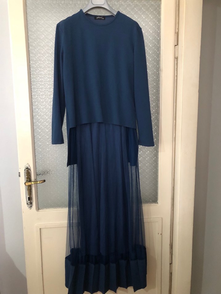 Lacivert uzun elbise, pilili etek ve uzun kollu, yuvarlak yaka tasarıma sahiptir. Rahat kesimi ve yumuşak sentetik kumaşıyla günlük kullanıma uygundur. Esnek kumaş sadece 2 defa giyildi 40 bedene olur