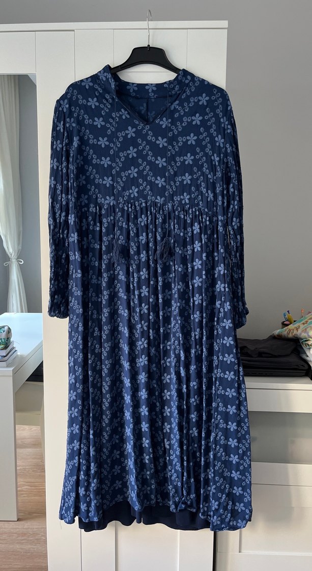 Lacivert uzun keten elbise, bol kesim ve pilili detaylara sahiptir. V yaka ve uzun kolludur, batik desenli bohem tarzı sunar. Omuzdan boy uzunluğu 125cm