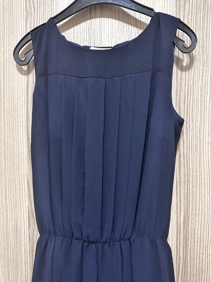 Lacivert, kolsuz, piliseli ve vücuda oturan uzun elbise. Düz sentetik kumaştan, yuvarlak yakalı, ofis kullanımı için uygun. Kuşaklı