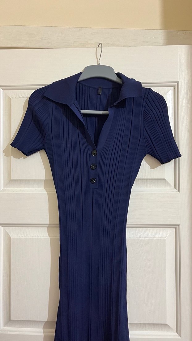 Lacivert piliseli dokulu, kısa kollu, polo yaka midi elbise. Yumuşak sentetik kumaştan, rahat sokak stili için uygun. Bir kere giyildi