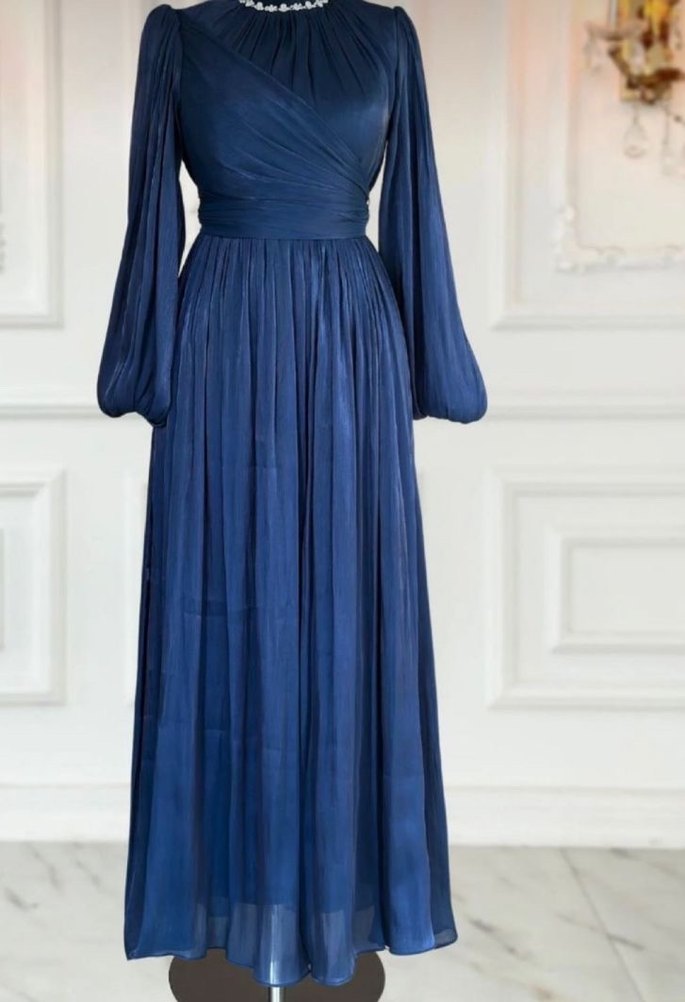 Lacivert, piliseli uzun abiye elbise, tek renk ve tek düğmeli, teknelik yakalı ve uzun kolludur. Klasik şıklık için idealdir. ✨