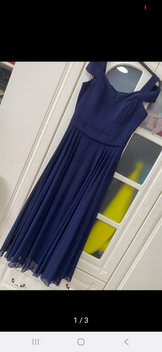 Lacivert, kolsuz, tekne yaka ve piliseli uzun etek detaylı modern klasik kesim abiye elbisedir. Omuzdan Aşağı 147 cm Bel ölçüsü 43 Cm Elbise normalde 44 beden ama kenarlardan daraltıldı
