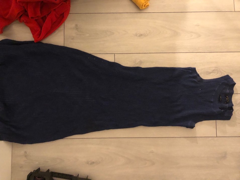 Lacivert renkte, yumuşak keten kumaştan yapılmış, piliseli ve vücuda oturan uzun elbise, rahat ve normcore tarzı için uygundur.