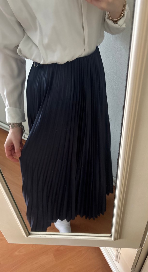 Lacivert piliseli uzun etek, sentetik kumaştan, bol kesim. Ofis için uygun, trendi gündelik ve gotik Paris tarzında. Hiç giyilmedi