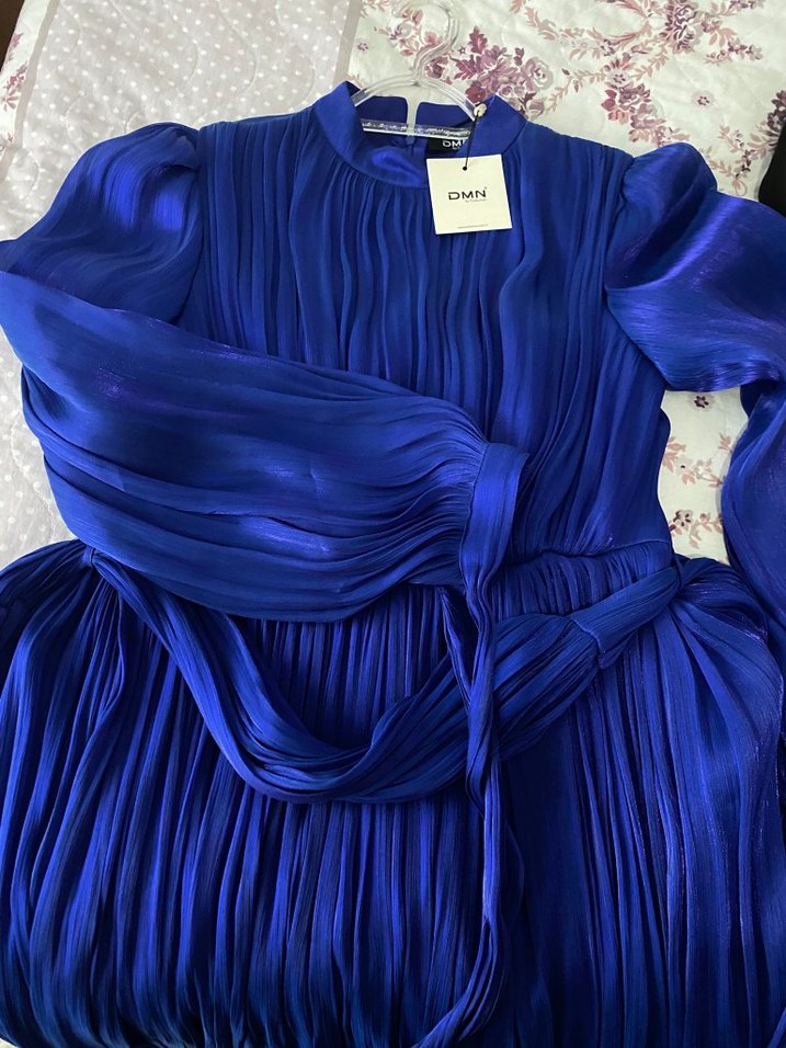 Lacivert piliseli, ipeksi kumaşlı uzun elbise, bol kesim ve kayık yaka. Bohem tarzda, düğünler için uygun. İnce askılı kollar detay katıyor. Ürün Ölçüleri: Bel:80 Göğüs:95 Elbise Bedeni:42 Renk:Gece Mavisi Kumaş:Yoryo Elbise daha önce hiç giyilmedi. Etiketi Üzerinde. Almak isteyen kişiye pazarlık payı yapılır.