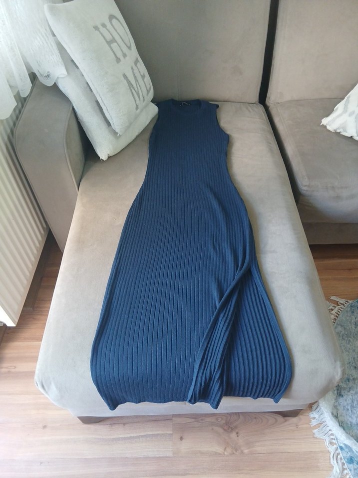 Lacivert, kolsuz, yüksek yakalı ve piliseli detaylı uzun kadın elbisesi. Yumuşak sentetik kumaştan, rahat ve şık bir görünüme sahiptir.