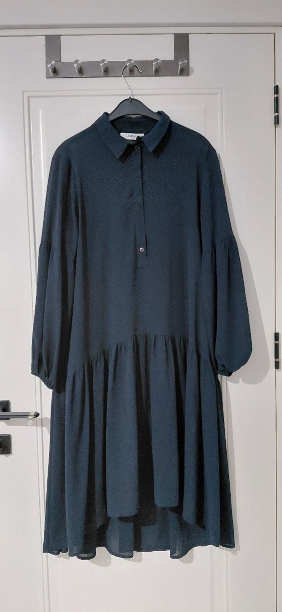 Lacivert uzun elbise, yakalı ve uzun kollu, bol kesim ve piliseli tasarıma sahip, yumuşak sentetik kumaştan minimal ve normcore tarzda.