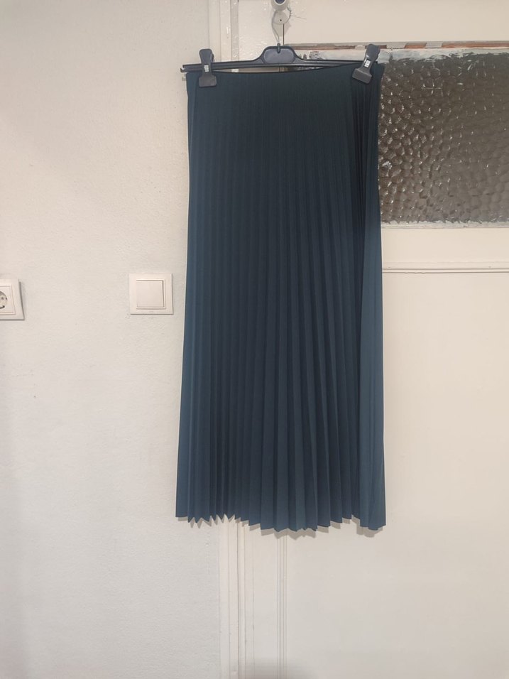 Lacivert sentetik kumaştan, piliseli ve uzun kesime sahip, vücuda oturan kadın eteği. Desensiz sade tasarımıyla Paris normcore stilini yansıtıyor. tekli fiyat 200