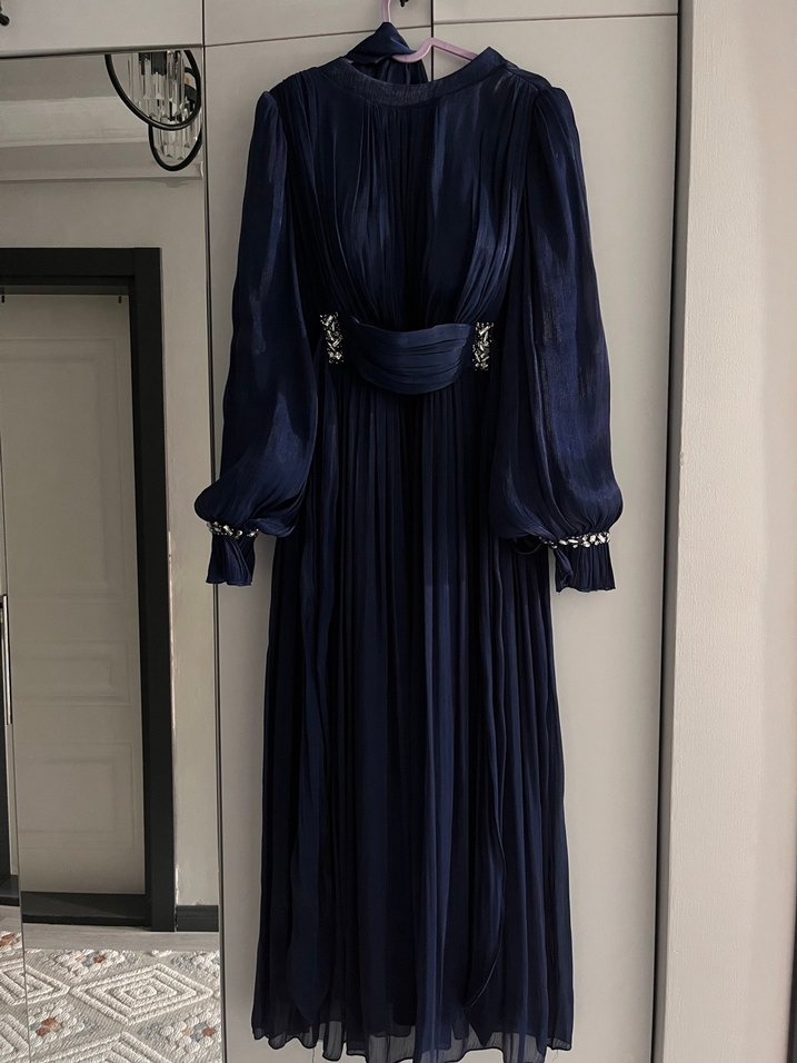 Lacivert renkte, piliseli kumaşlı, yüksek yakalı ve uzun kollu gece elbisesi. Gevşek kesimi ve nakış detaylarıyla gotik tarzda düğünler için uygundur.