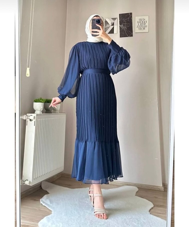 Lacivert Piliseli Uzun Kollu Uzun Elbise
