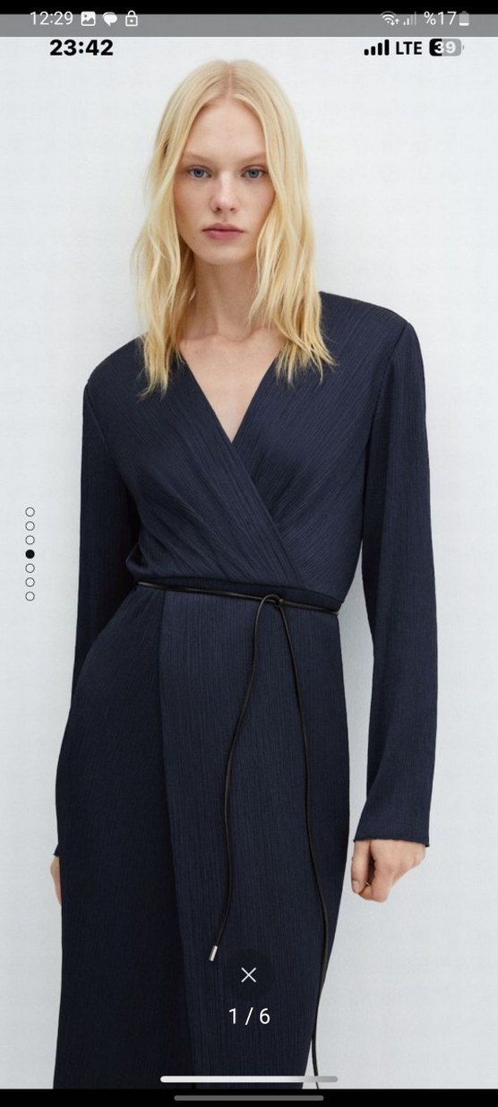 Lacivert uzun elbise, V yaka ve piliseli tasarıma sahip, uzun kollu ve regular fit. Sentetik kumaştan üretilmiş, ofis için minimalist ve çağdaş tarzda. mango marka 1 kez giyildi herhangi bi sikintiisi yoktur. Dökümlü kumaş. Dokuma kumaş. Midi boy. Anvelop model. Anvelop v yakalı. Uzun kollu. Kemer köprülü. Yandan görünmez fermuar kapamalı. Çıkarılabilir kemerli. Ofis görünümü.