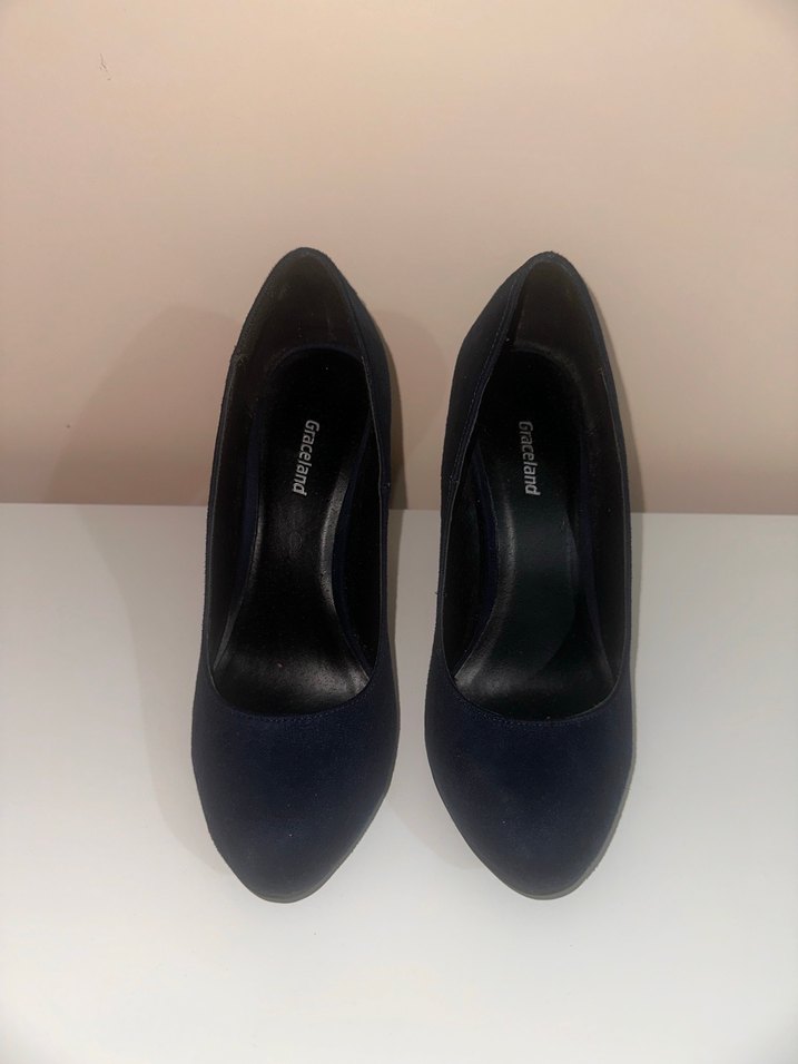 Lacivert renkte, kauçuk malzemeden platform topuklu kadın ayakkabı. Minimalist ve zahmetsiz şıklık sunar, ofis için uygundur.